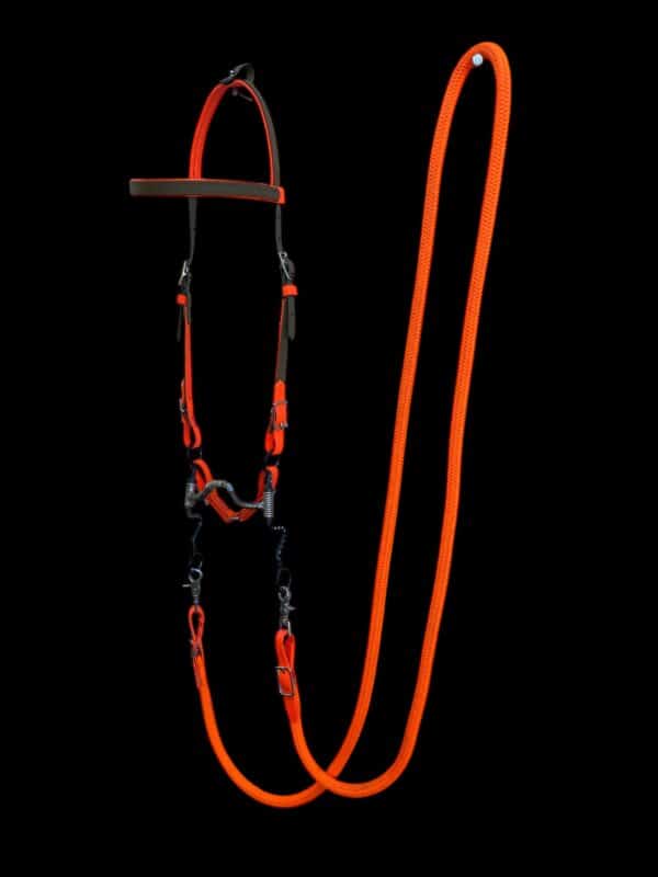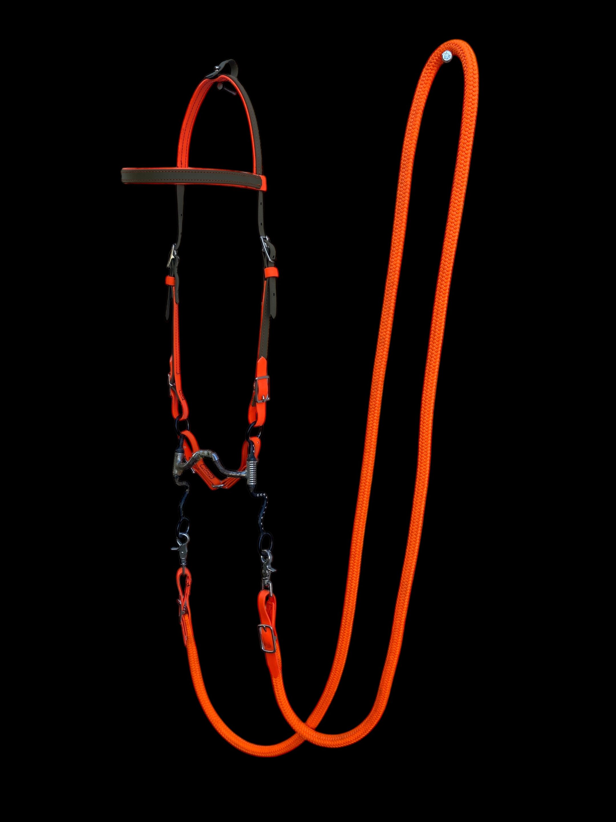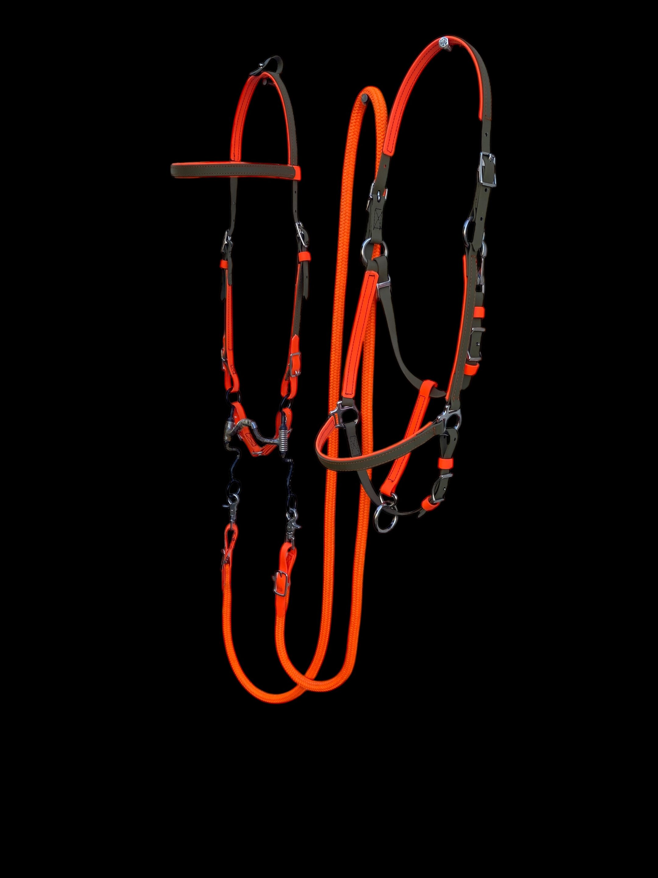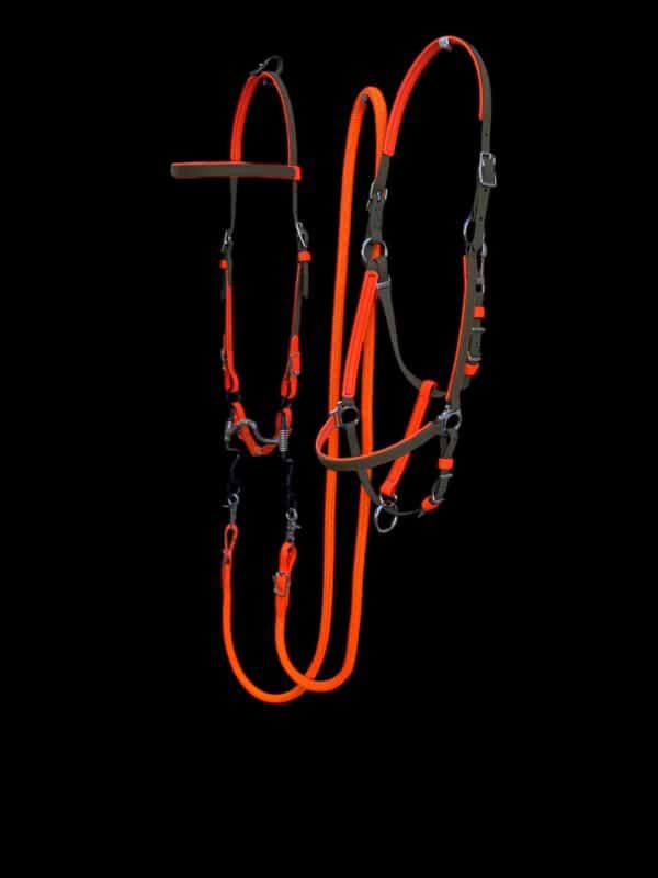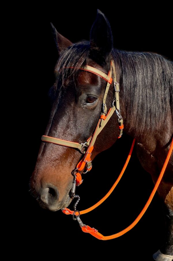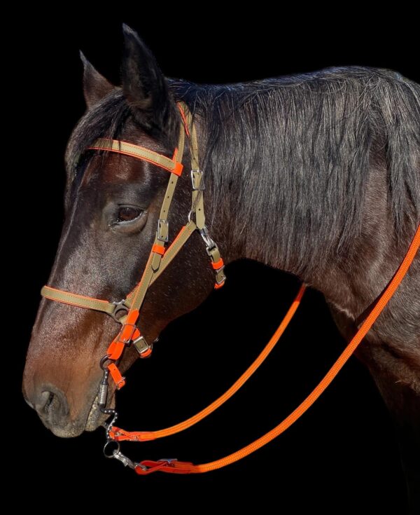 The headstall shown is olive drab with a hunter orange underlay in horse size. Made with stainless steel hardware throughout for strength and easy upkeep. MATCHING 9' ORANGE REINS ARE SOLD SEPARATELY.